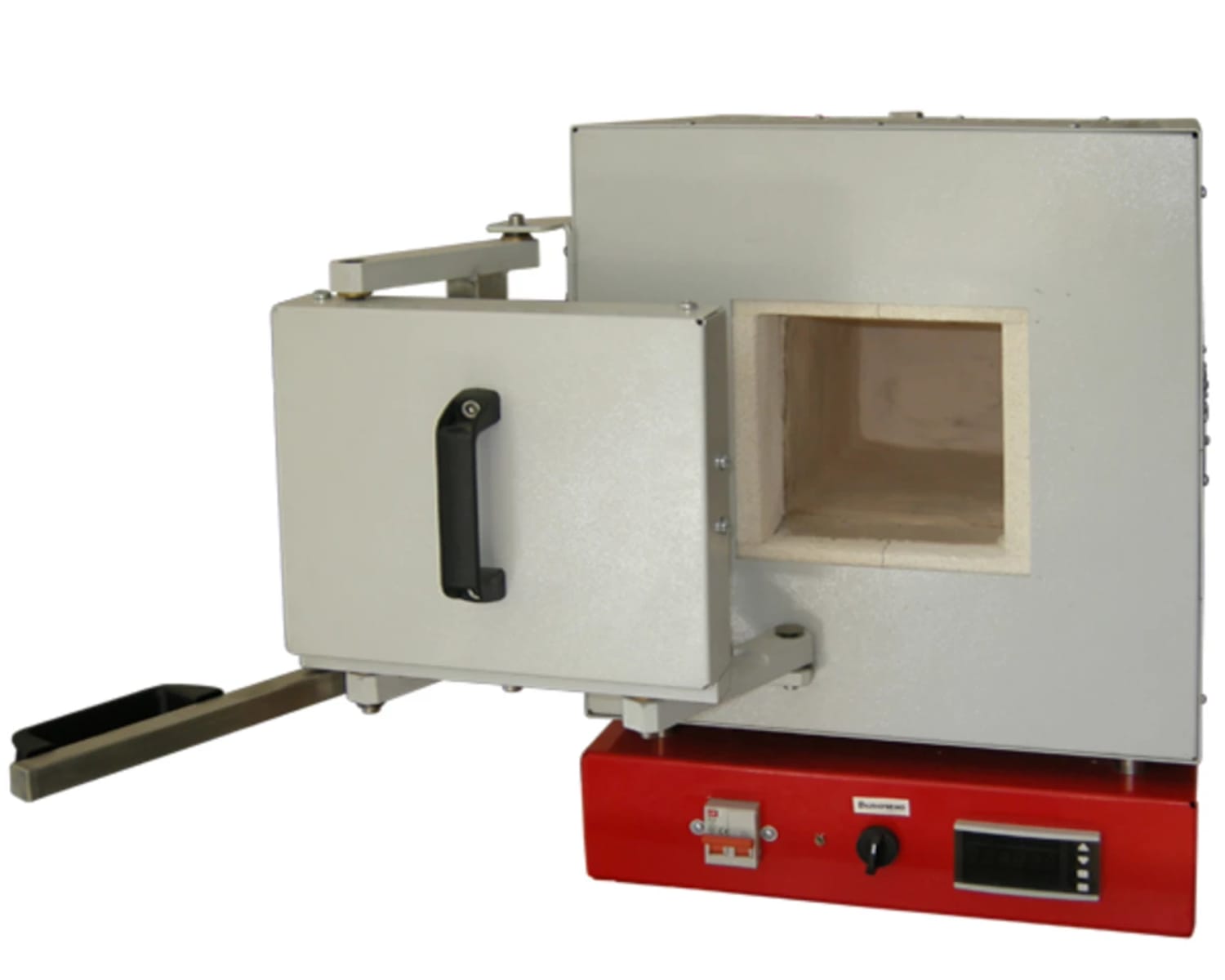 The muffle is cast from a high temperature and ceramic mass around which the heaters are wound. The muffle furnace is equipped with a profile thermoregulator that allows 5 different programs to be set, for each program up to 5 thermal zones can be set, each with a heating or cooling rate and a temperature maintenance time. The thermostat retains the programmed modes after the power is switched off. The muffle furnace heaters are connected to a solid state switch that turns them on and off currentless. This extends the life of the heating elements and improves the accuracy of temperature maintenance. The door of the muffle furnace is opened so that the heated surface does not radiate to the hands of the furnace operator.