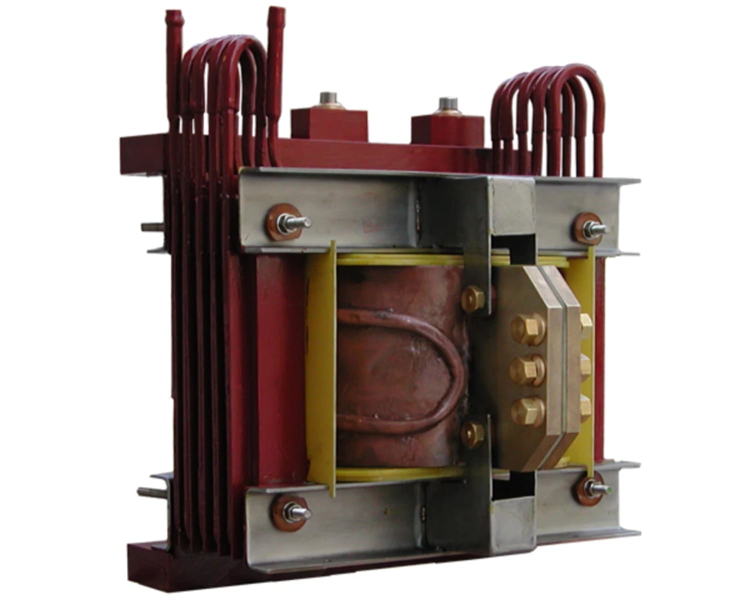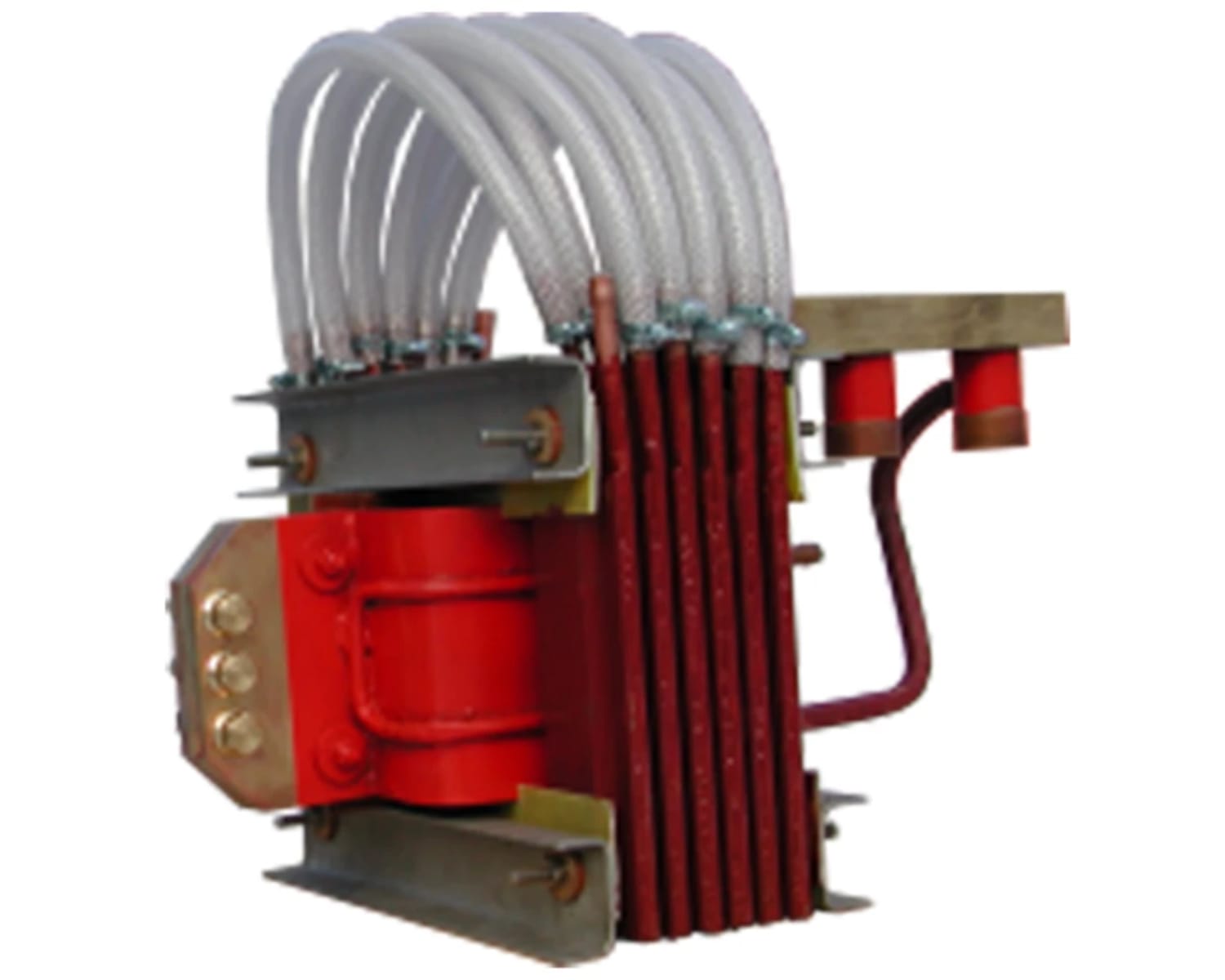 The high-frequency matching transformer is designed for high frequency hardening machines, as the hardening inductors are directly attached to the transformer.