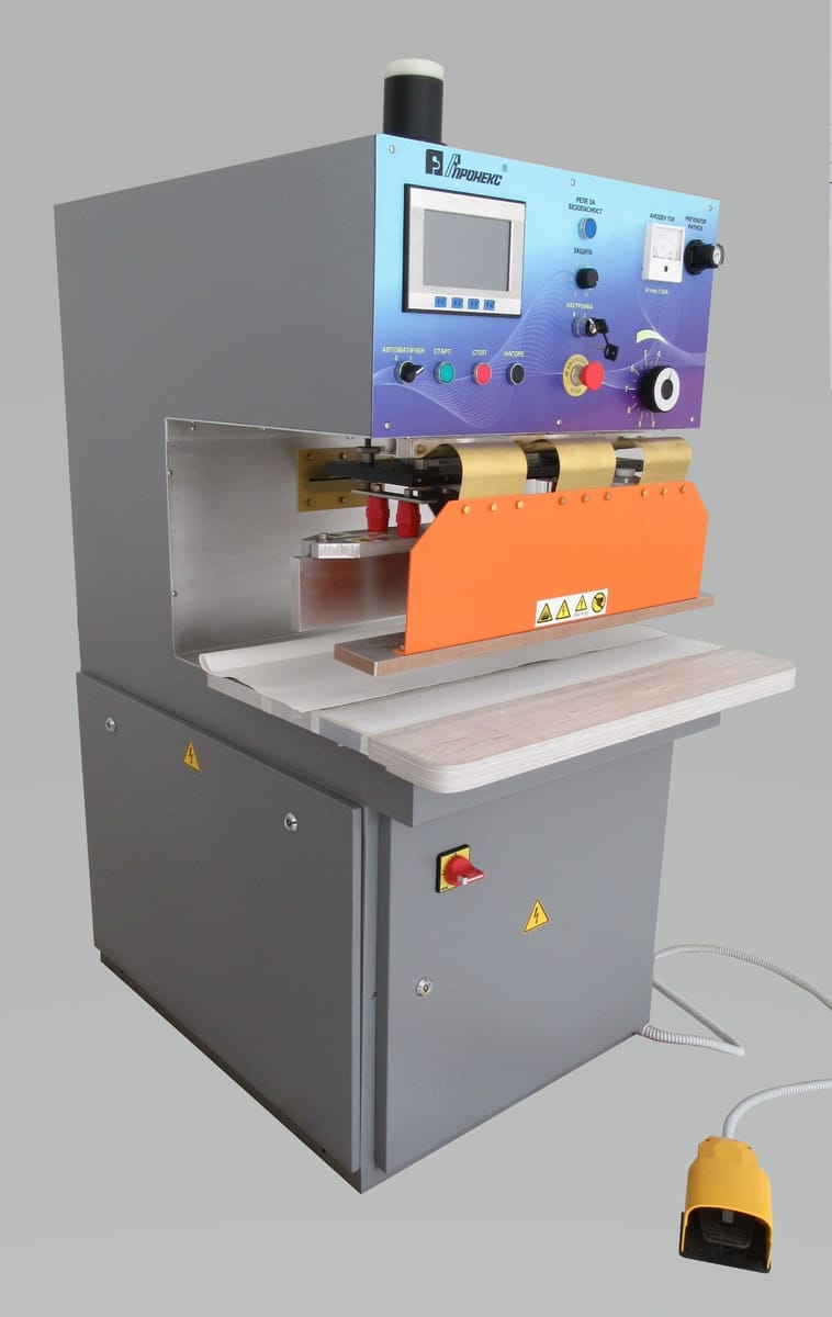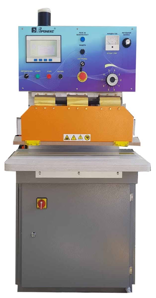 UZP 4500 is designed for high-frequency welding of soft PVC foil, artificial leather or PVC-coated fabric. It is equipped with a high-frequency generator with 4,5 kW power and a specialized press with pneumatic pressure up to 400 kg.